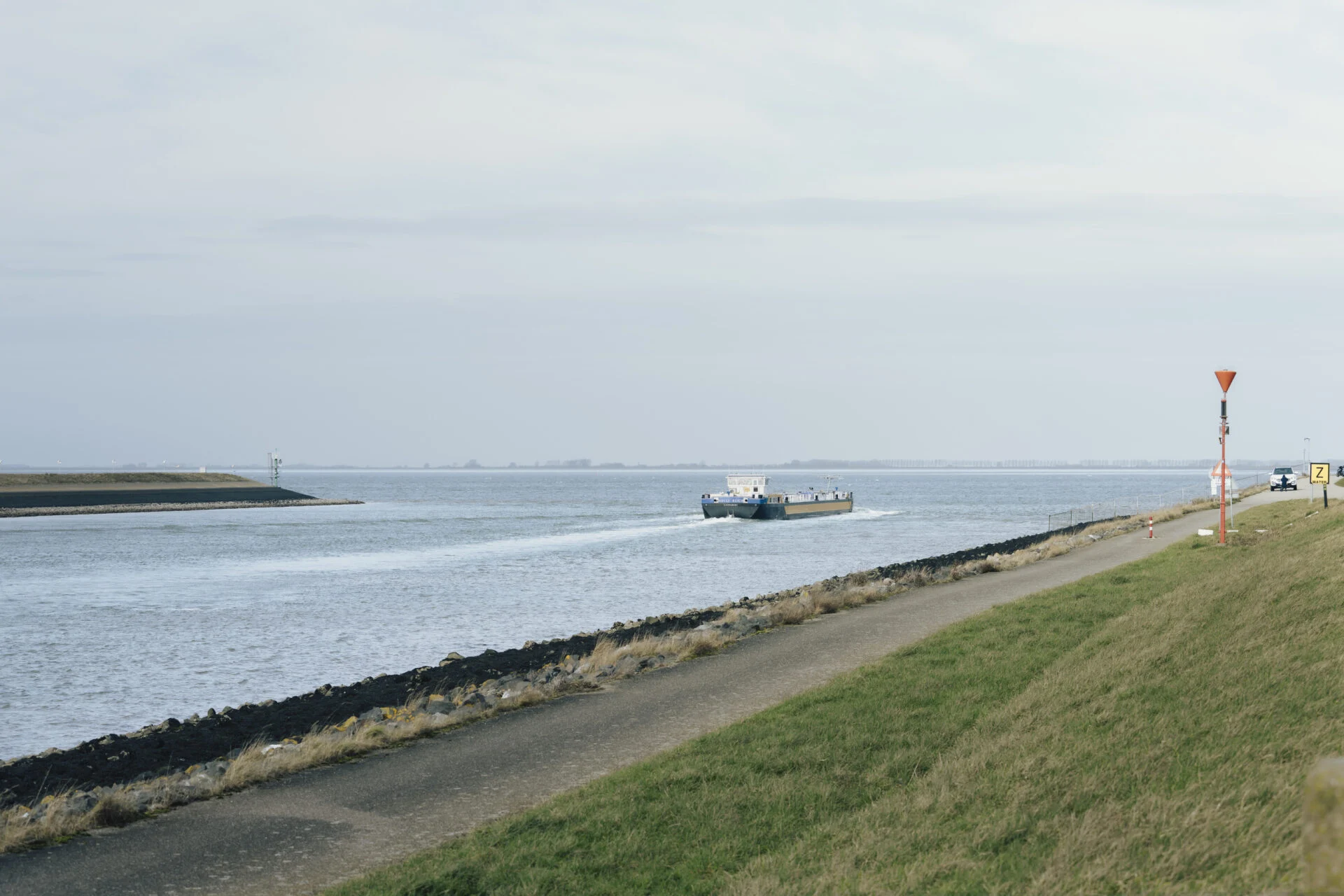 Zodra je het Kanaal door Zuid-Beveland opvaart, verandert de dynamiek van je tocht. Het open water maakt plaats voor een lange, rechte baan die zich strak voor je uitstrekt. Oevers begeleiden je koers, terwijl akkers zich in brede vlakken aan je voorbijtrekken. In de verte doemen dorpsranden op: kerktorens, daken en een enkele steiger die het water raakt. De motor zoemt gelijkmatig en achter je trekt een rustige hekgolf een spoor door het oppervlak.
